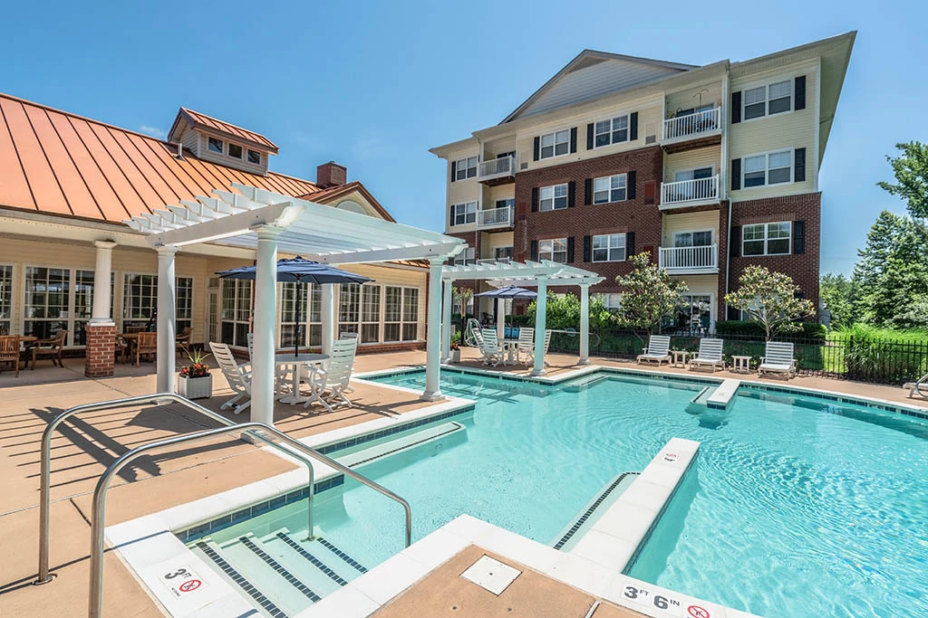 One- and two-bedroom floor plans, a seasonal pool, fitness center, game rooms, a library, and landscaped green areas define the lifestyle. The community balances elegance with accessibility, wide hallways, accessible common spaces, and a focus on comfort plus style.